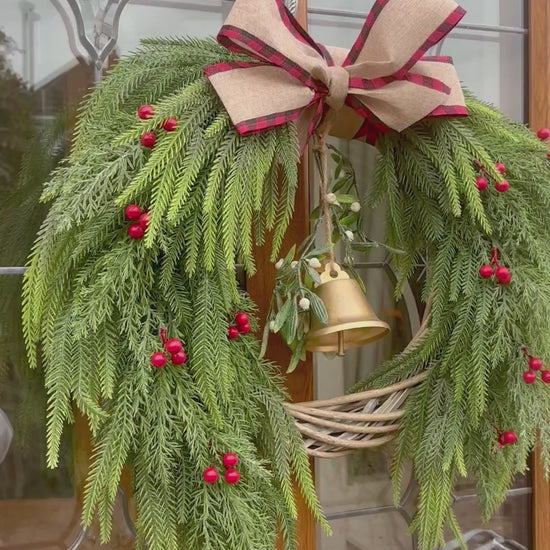 Handcrafted on a soft grey wicker frame, this 45cm wreath features real-touch weeping Norfolk pine, gently draping for a natural, relaxed shape. At its heart hangs a large festive bell surrounded by mistletoe, creating a look that’s both simple and sophisticated — perfect for those who love timeless Christmas décor with a touch of rustic luxury.