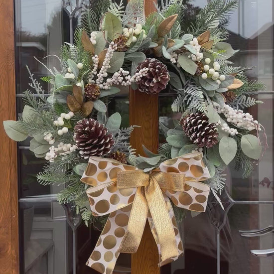 Handcrafted with lush green foliage, clusters of white berries, and an assortment of large and small pinecones, this 40–45cm wreath combines texture and tradition. The look is completed with a beautiful feature bow in gold and ivory, adding a subtle touch of luxury to its natural, woodland base.
