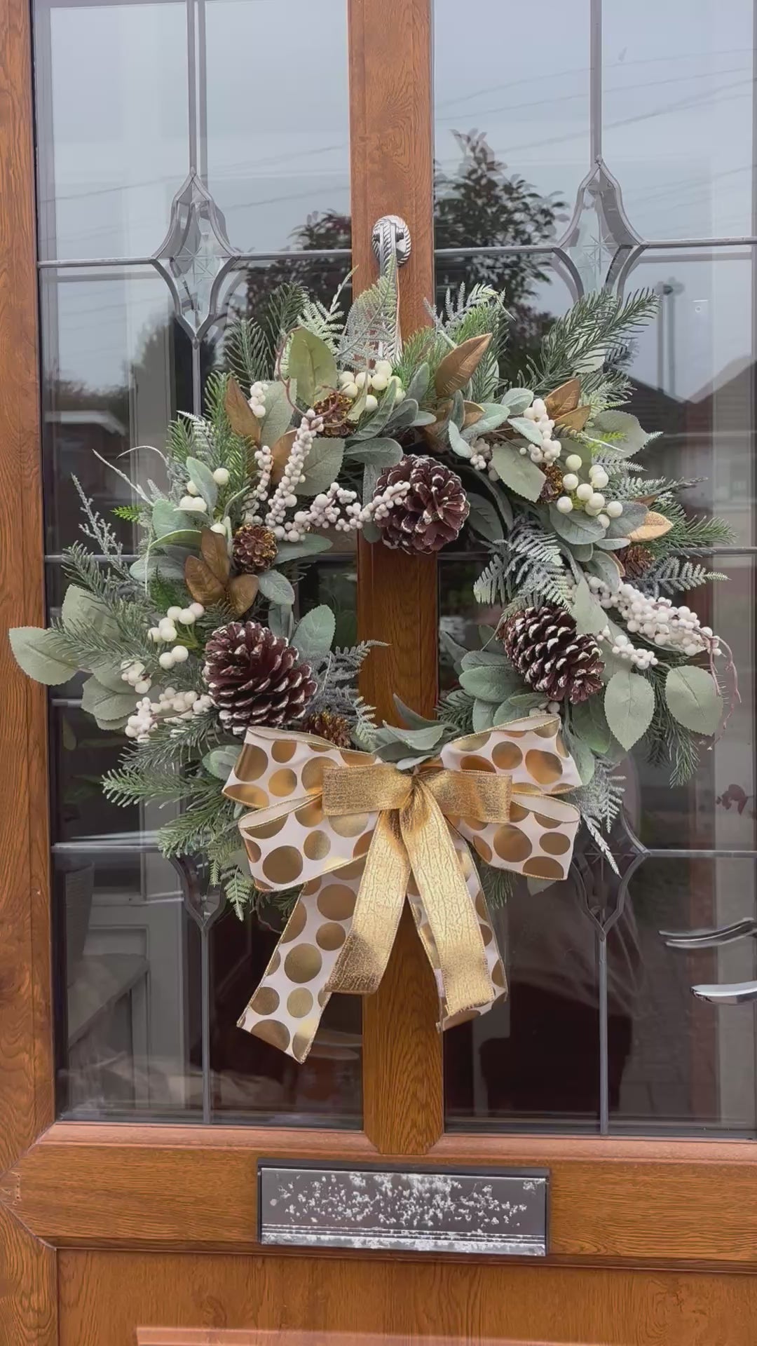 The Gold & Ivory Pinecone Wreath brings understated festive beauty to your home — ideal for those who love classic Christmas décor with a modern, elegant twist. It pairs beautifully with neutral interiors and warm fairy lights.