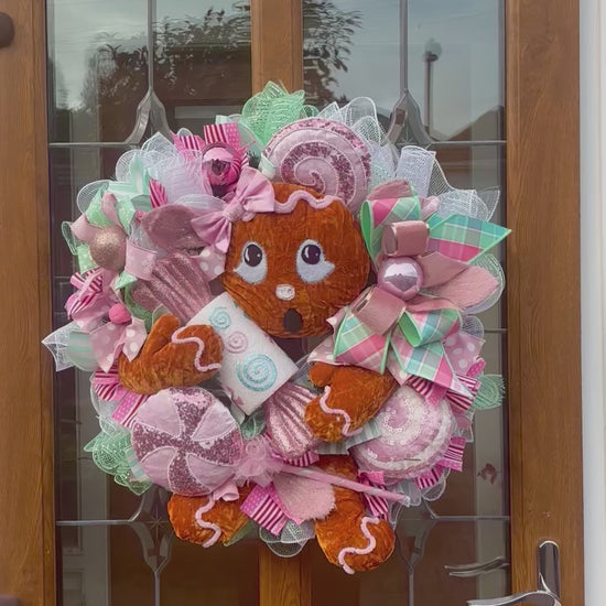 Meet the Runaway Gingerbread Wreath — a playful, candy-inspired creation bursting with festive fun