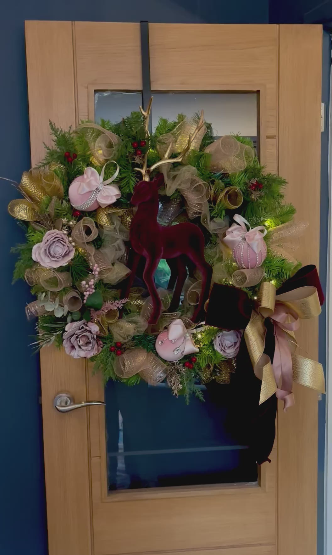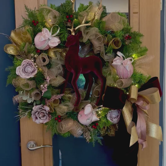 Handcrafted with lush spruce foliage and vibrant red berries, this wreath is accented with rose gold mesh, snow-dusted pink roses, and three ornate, velvet jewelled baubles that shimmer with festive luxury. At its heart stands a deep red stag, the majestic centrepiece that brings the entire piece together in striking harmony.