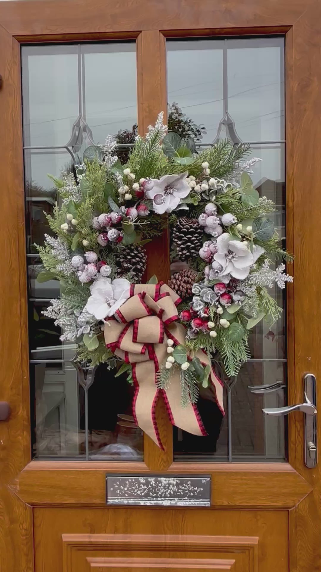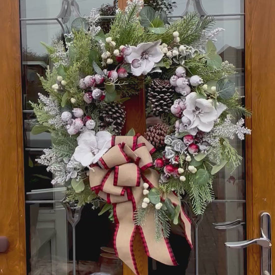 Handcrafted with natural green foliage, snow-dusted white Christmas roses, large frosted red berries, and clusters of pinecones, this 40–45cm wreath captures the perfect balance of festive and rustic. Finished with a plaid-trimmed burlap bow, it adds a comforting, country charm that feels like Christmas morning in a cosy cottage.